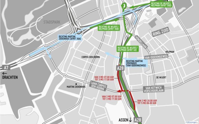 Restpunten bij Groningen-Zuid: A28-afritten komend weekend dicht
