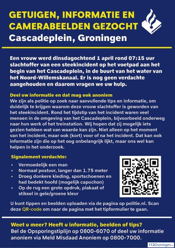 Steekincident Cascadeplein Groningen, 1 vrouw(47) gewond, politie zoekt nogsteeds tips (update)