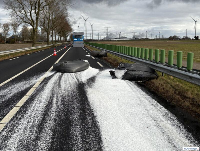 Eemshaven – Op de N33 net voor de Eemshaven aan heeft een vrachtwagen bigbags met