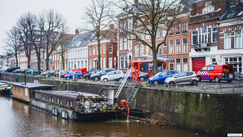 Woonboot maakt water aan het Lopendediep in Groningen, brandweer pompt boot leeg