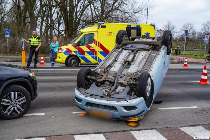 Auto op de kop na aanrijding met andere auto in Groningen (video)
