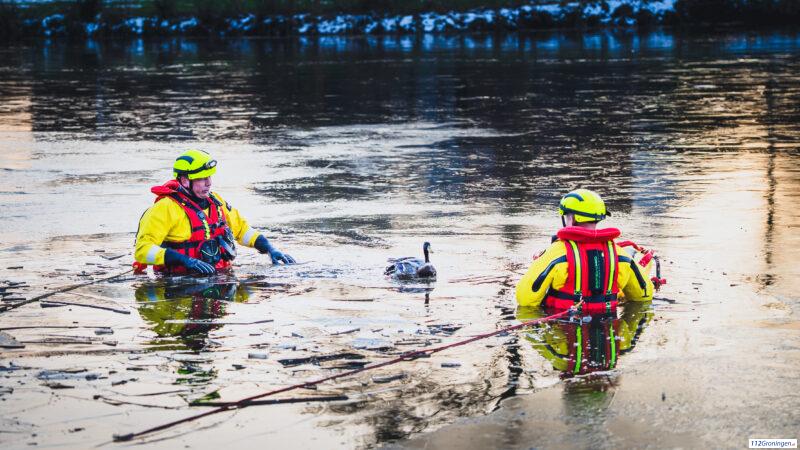 Brandweer bevrijdt vastzittende eend uit het ijs in Appingedam