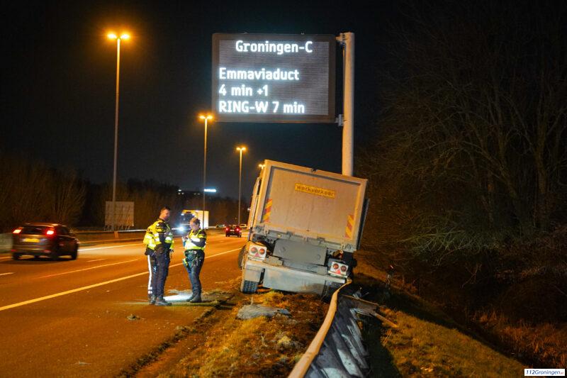 Haren – Een vrachtwagen is vrijdagavond tegen een vangrail op de A28 tussen Haren en