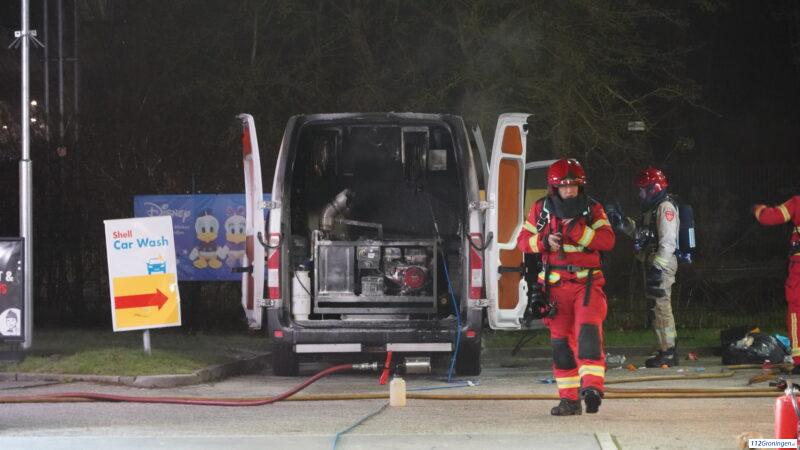 Bestelbus in brand bij Shell tankstation aan Zonnelaan in Groningen
