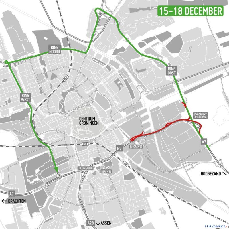 Groningen – De zuidelijke ringweg is van vrijdag 15 december 22:00 uur tot maandag 18