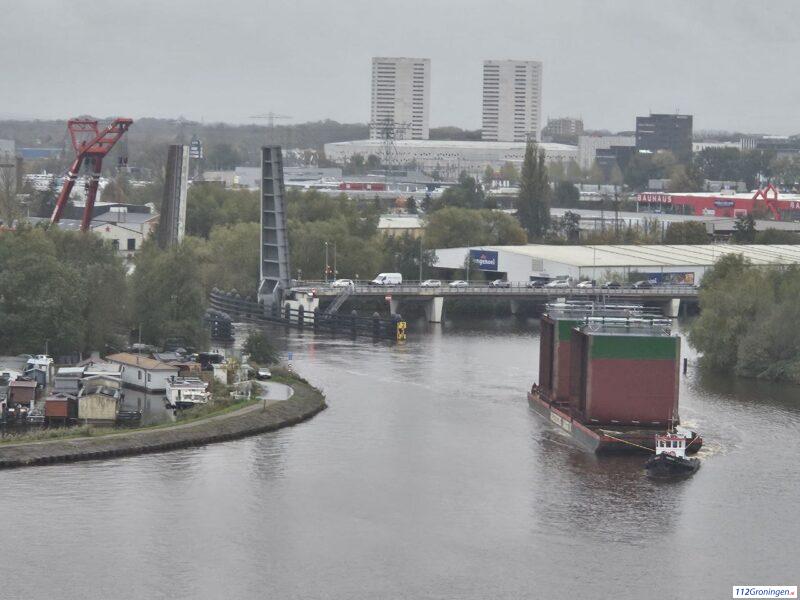 Groningen- Een groot transport(een schip met twee grote delen van een nog te bouwen schip)