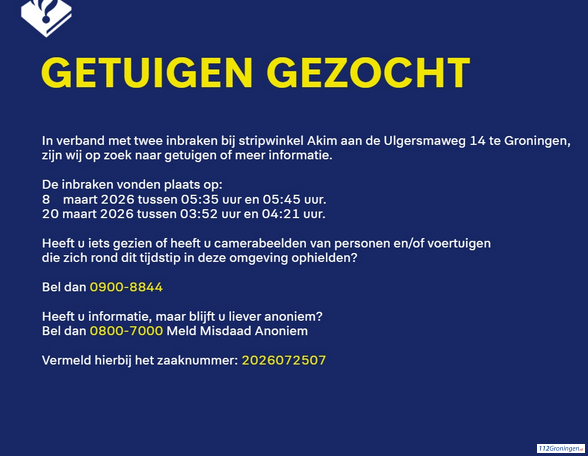 Groningen – In verband met twee inbraken in de stripwinkel Akim aan de Ulgersmaweg, zijn
