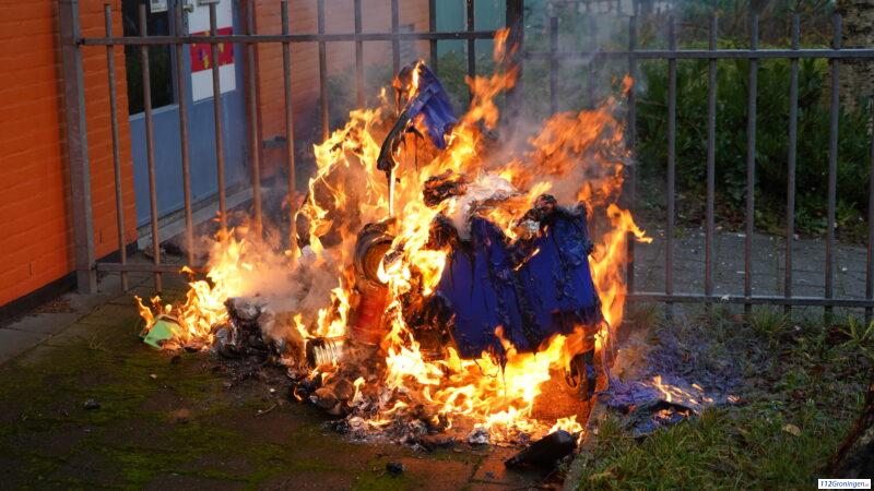 Groningen- Bij een basisschool aan de Sweelincklaan in Groningen is zondagmiddag een afval container volledig