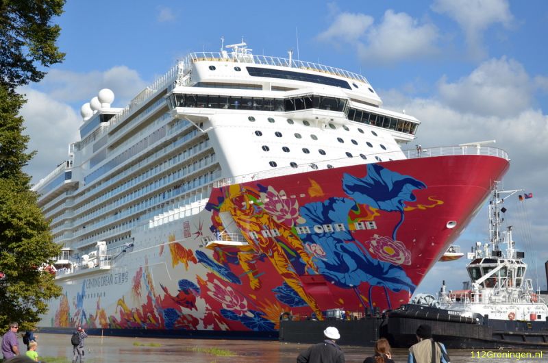 Zondagmiddag is het nieuwste cruiseschip de Genting Dream van 335 meter lang en 44 meter
