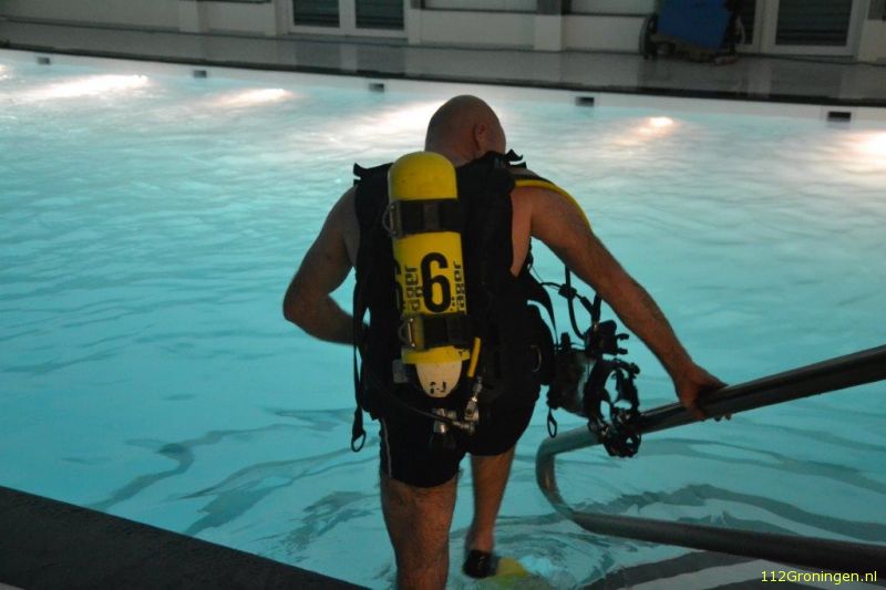 De duikers van brandweer Delfzijl hielden donderdagavond een oefening in fitnesscentrum Performance in Wagenborgen.