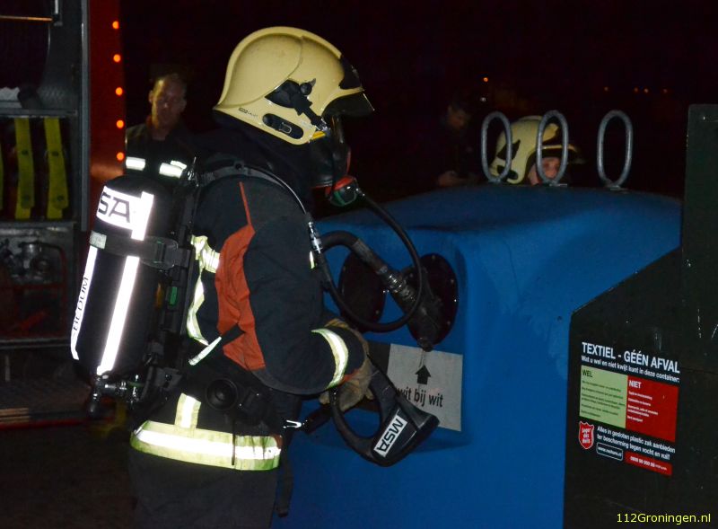 Zaterdagavond werd het brandweerkorps van Bedum opgeroepen voor een kledingcontainer in brand aan de Waldadrift