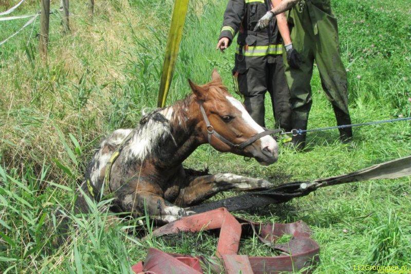 Een toevallig passerende auto zag dat er een paard vast zat in de sloot.