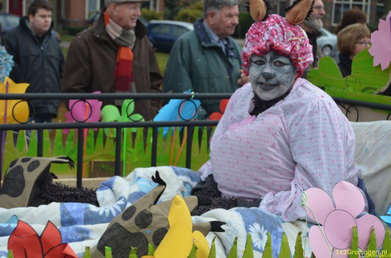 De carnavalsoptocht in Ter Apel werd zaterdag weer druk bezocht . Tientallen praalwagens reden door