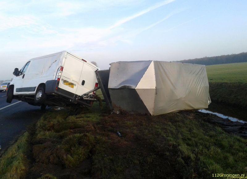 Vanmiddag is bij en ongeval een busje met aanhanger over de kop gegaan.