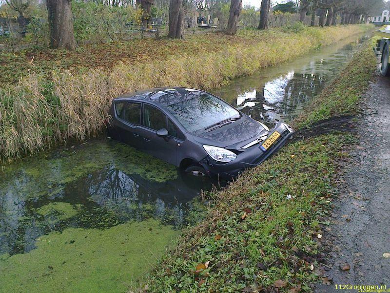 Dinsdagmorgen moest autoberger Faber uitrukken voor een auto te water aan het Smeltenpad in Warffum.