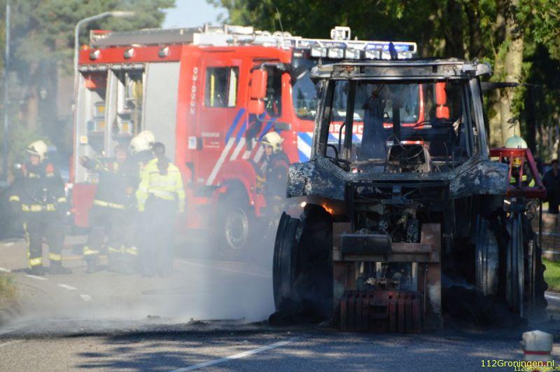 Op het Zuiderdiep in Valthermond is dinsdagmiddag een tractor volledig door brand verwoest