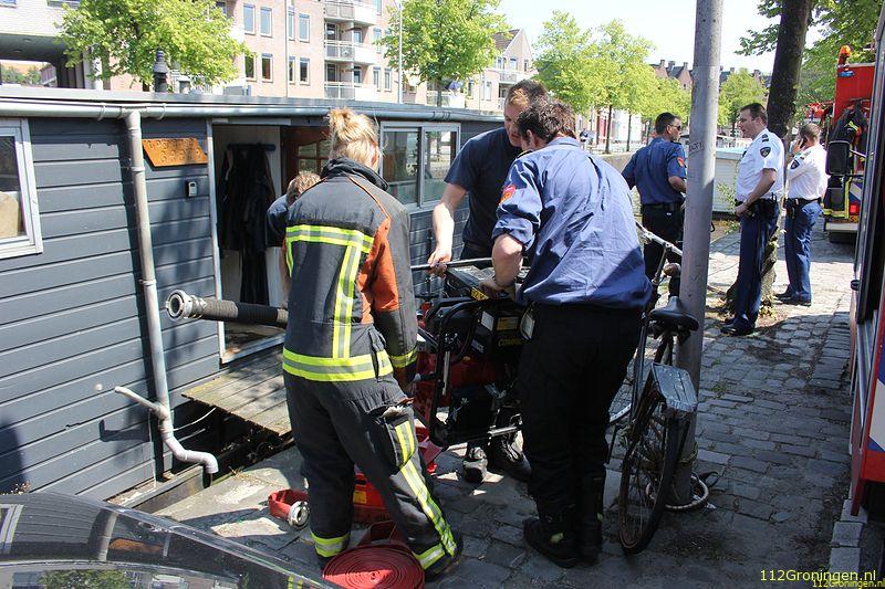 Een woonboot aan de Turfsingel in Groningen heeft zaterdagmiddag veel schade opgelopen doordat er een