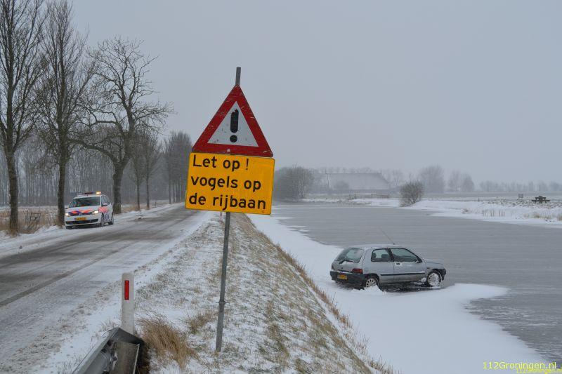 Een automobilist is maandagochtend tussen Onderdendam en Bedum met zijn wagen op het ijs beland.