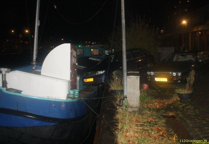 Donderdagavond is een auto half op een schip beland op de Oosterhamrikkade nadat de bestuurster