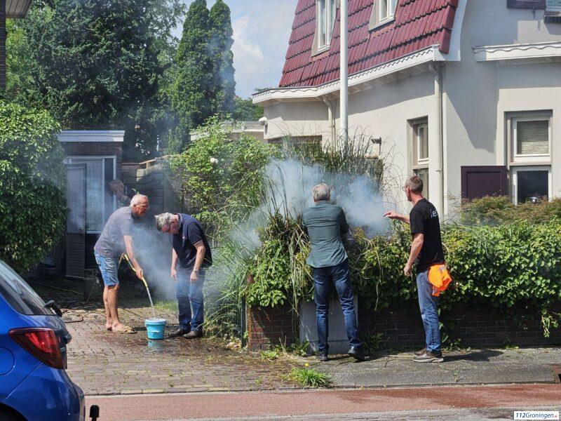 Brand in tuin, buren/omstanders blussen met tuinslang en emmers