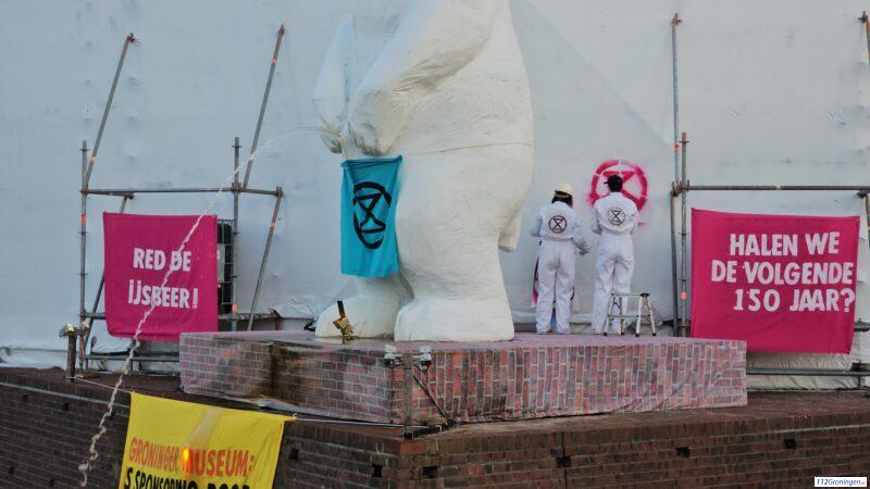 Actie Extinction Rebellion tegen Groninger Museum bij pissende ijsbeer