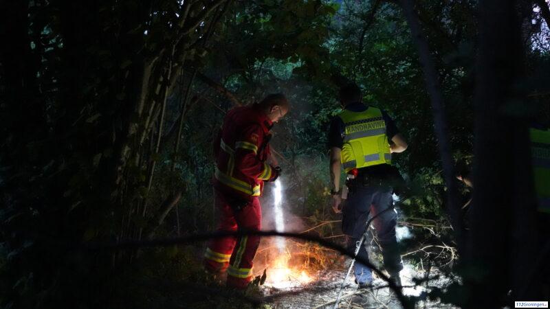 Brandweer en handhaving blussen een uitgebrande tent