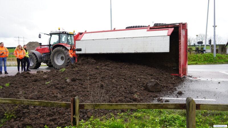 Aanhanger vol modder kantelt op de Winschoterweg, file tot gevolg