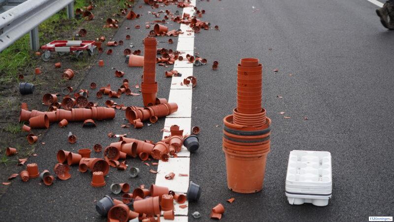 Groningen- Op de A7 tussen Groningen en Hoogkerk liggen meerdere rijstroken met lege bloempotten(plastic) bezaaid.