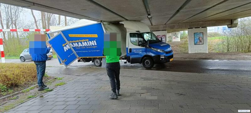 Bestelwagen Mamamini muurvast bij viaduct Popdijkemaweg