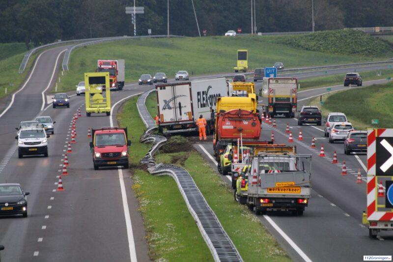 Vrachtwagen in berm en raakt tegen vangrail in middenberm bij Heiligerlee (update)