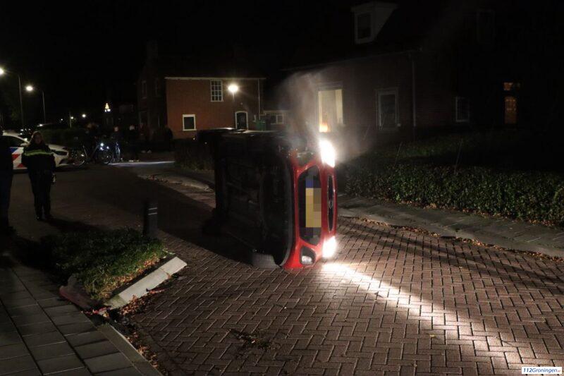 Auto op zijn kant in de G.P. Beukemalaan in Grootegast