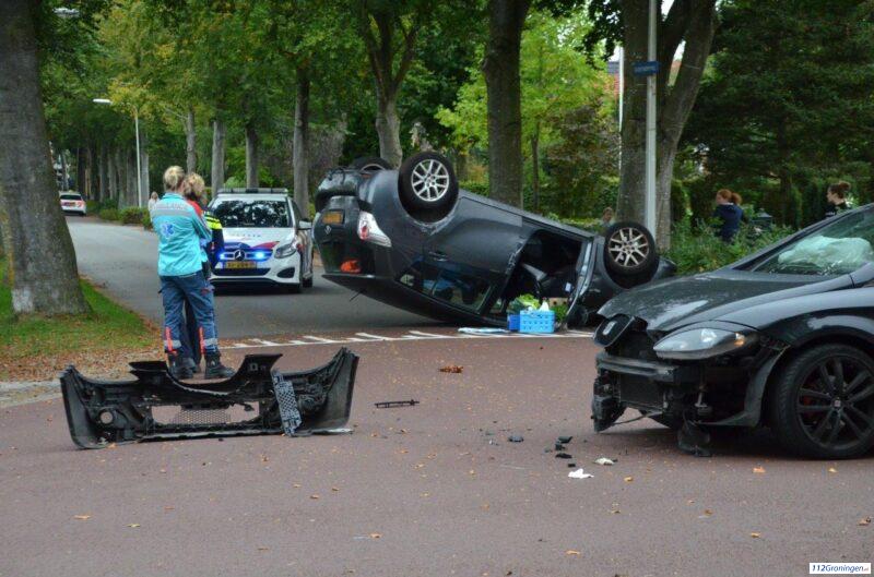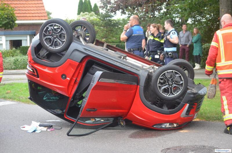45 km/u auto op de kop na botsing met automobilist, 2 mensen gewond
