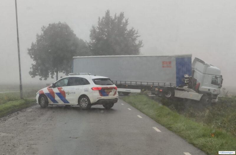 Truck vast boven sloot op de Damsterweg bij Appingedam, weg gestremd