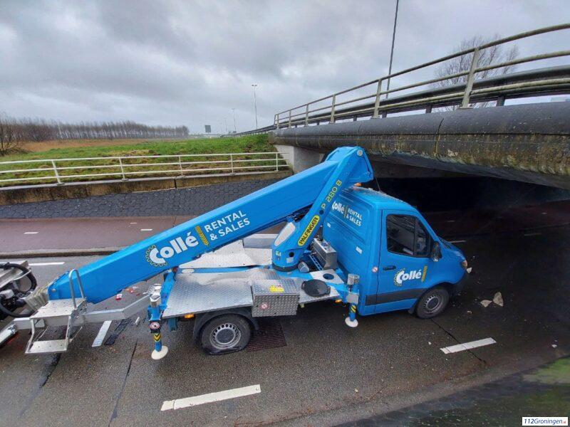 Groningen – Op de Olgerweg is zondagmiddag een kleine hoogwerker tegen het viaduct gereden. Het