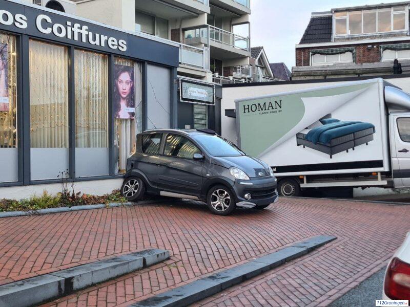 Brommobiel rijdt achterwaarts tegen gevel kapper in Haren
