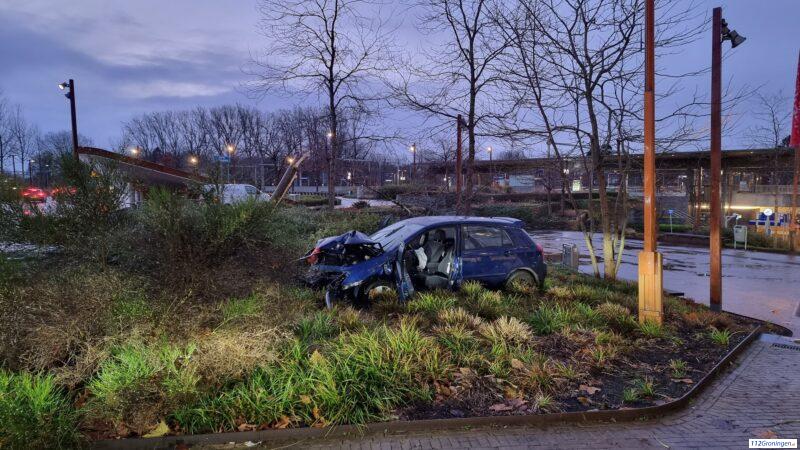 Auto belandt in de bosjes naast de Bedumerweg na crash met reclamezijl