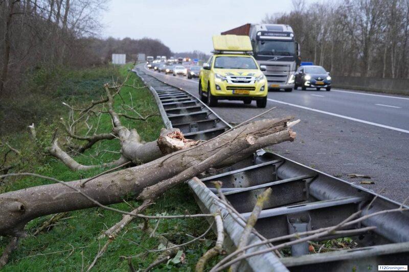 Boom omgewaaid op A28 bij De Punt, forse file tot gevolg (Video)