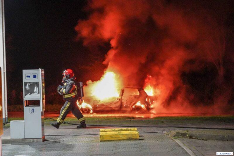 Felle brand verwoest auto bij Shell Witte Molen op de A28 (Video)