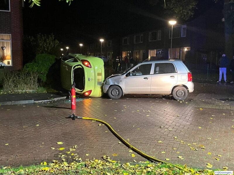 Auto belandt op zijn zijde na aanrijding Lindenlaan Nieuwe Pekela