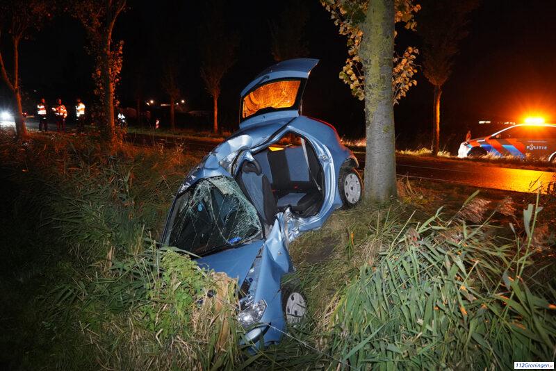 Auto rijdt tegen boom in flauwe bocht op de N388 bij Grijpskerk, drie gewonden (update)