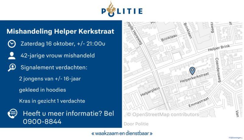 Groningen – De vrouw die zaterdagavond gewond raakte bij een mishandeling in de Helper Kerkstraat