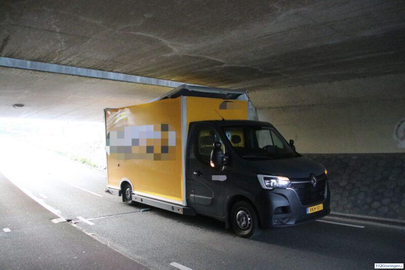 Groningen – Een bestelwagen van een supermarktketen is zaterdagmiddag vast komen te zitten onder het