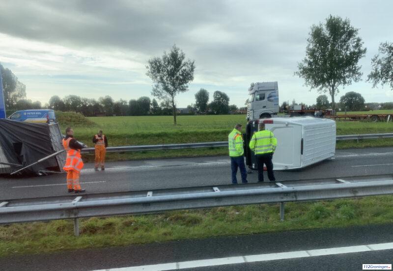 Bestelwagen met aanhanger kantelt op de A7 bij Zuidbroek, Stremming voorbij (update)