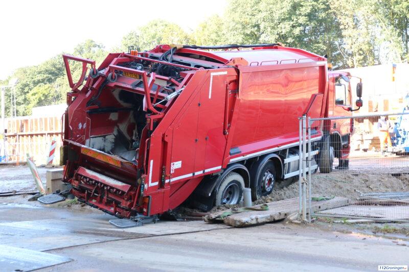 Vuilniswagen Gemeente Groningen raakt vast in het zand
