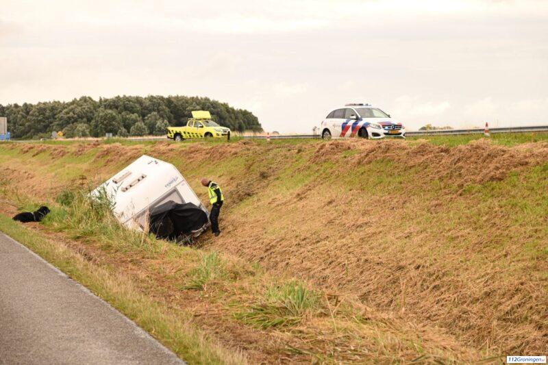 Maandagochtend is een caravan naast de weg terecht gekomen nadat deze achter een personenauto weg