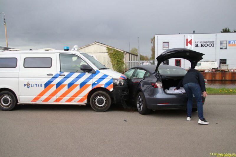 Op de Gideonweg in de stad Groningen zijn donderdagmorgen een politieauto en een Tesla met