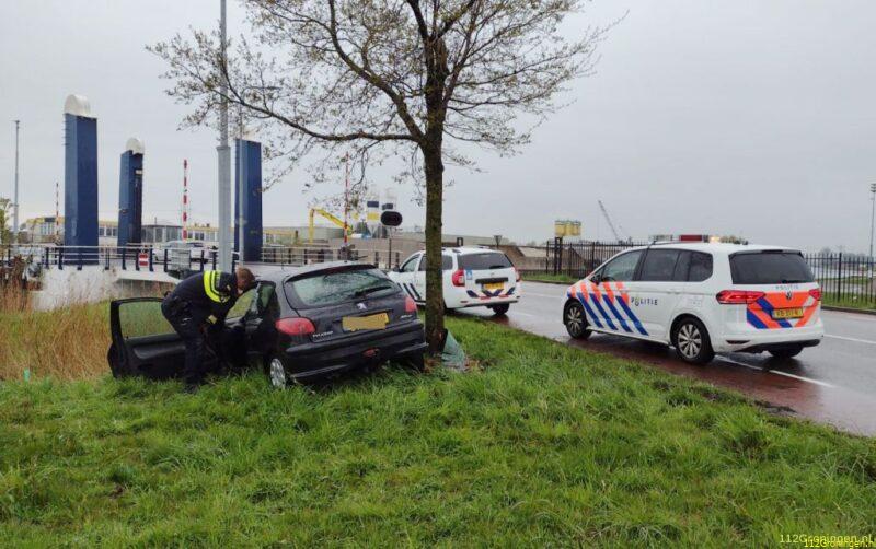 Langs het Hoendiep in Hoogkerk is donderdagmiddag een auto tegen een boom gereden. Van de