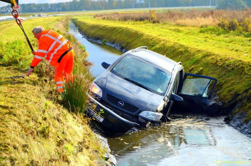 Op de afrit van de A7 bij Zuidbroek is zaterdagochtend een auto te water geraakt.