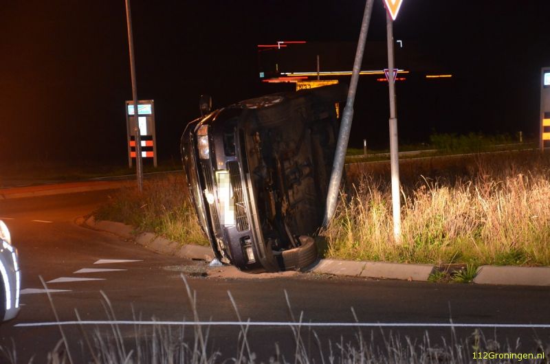 Op de rotonde bij de K.J. de Vriezestraat in Wildervank is dinsdagavond een bestelbusje over