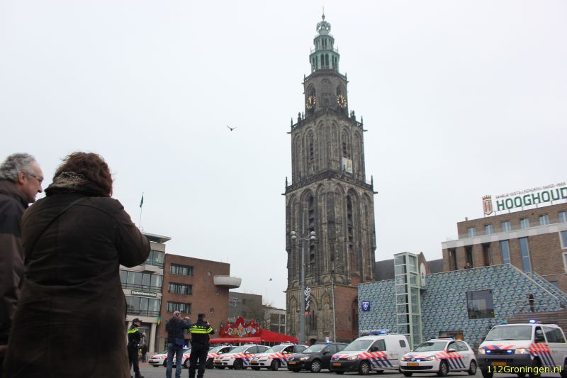 Om 11:59 uur was het een herrie op de Grote Markt in Groningen. Politiemensen deden